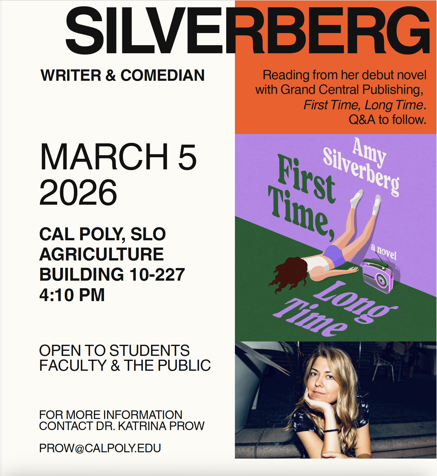 We are thrilled to announce that writer and comedian Amy Silverberg will be visiting Cal Poly, SLO this quarter as a part of the English Department's Writers-at-Work Reading Series. Silverberg will read from her debut novel First Time, Long Time on March 5th at 4:10pm in building 10-227. This reading is open to faculty, students, and the public, and I appreciate your help publicizing this event on campus. A reading flyer with event information is attached to this email.